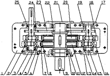 1—箱體,2、4、11、14、22—軸承,3、15—高速軸,5、18—環(huán)板,6、10、13、17、21、25—端蓋,7—針齒,8—滾動(dòng)套,9—低速軸,7、10、20—擺線輪,16—螺針,19、24—小齒輪,23—過(guò)橋齒輪。