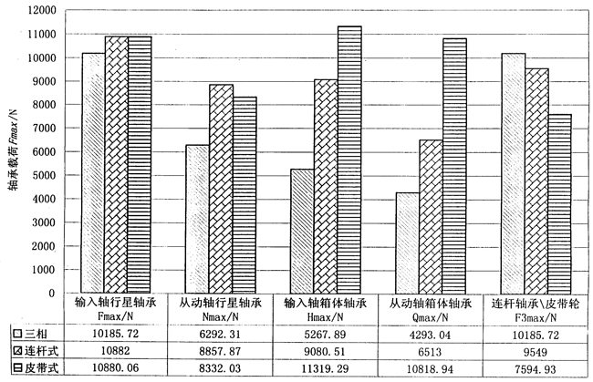 表3.5給出了不同形式的平行軸擺線針輪減速的軸承最大載荷,其中三相是指相位差均等為120的三環(huán)平行軸擺線針輪減速器。由表和圖3.20可知:連桿式和皮帶式的輸入軸行星軸承的最大載荷比三相的大約7%,而連桿式與皮帶式非常接近;對于輸入軸箱體軸承的最大載荷,皮帶式的最大,比連桿式的高約25%,比三相高級我110%。由此可見連桿式平行軸擺線針輪減速的承載能力比皮帶式強,比三相的略優(yōu)。
