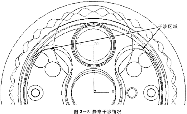 后三種都是實際結(jié)構(gòu)可能存在的,當(dāng)出現(xiàn)第一種干涉即硬干涉時就要引起高度重視,這可能是:設(shè)計存在問題,必須及時糾正。就是借助此功能,造型完成后,本人發(fā)現(xiàn)輸出盤與擺紅、輪間有硬干涉(見圖3-8),與設(shè)計此減速器的部門交換意見,原來他們在設(shè)計完后沒有發(fā)現(xiàn)此問題,等制造出成品后才發(fā)現(xiàn),便通過手工磨削將干涉部分除去。此處也充分體現(xiàn)了與傳統(tǒng)的設(shè)計方法相比,虛擬樣機(jī)技術(shù)有著不可比擬的優(yōu)越,即在制造第一臺物理樣機(jī)前就發(fā)現(xiàn)了機(jī)構(gòu)在結(jié)構(gòu)方面的缺陷。至于機(jī)構(gòu)的優(yōu)化和性能改進(jìn)方面,通過后面的仿真分析更能清楚地展現(xiàn)虛擬樣機(jī)技術(shù)的優(yōu)越。