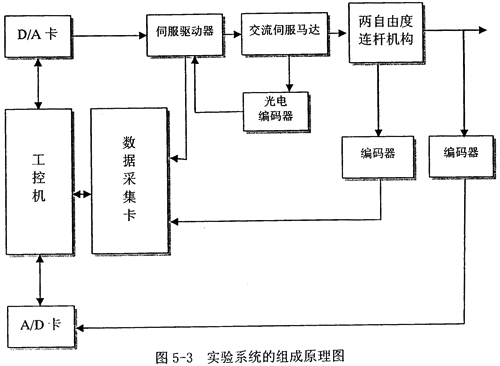 4.數(shù)據(jù)處理:(l)微機(jī)將電機(jī)位置信號(hào)作數(shù)值微分求得電機(jī)轉(zhuǎn)速。(2)微機(jī)用數(shù)字濾波程序?qū)⒓铀俣刃盘?hào)作濾波、數(shù)值積分等處理。如圖5-3所示為實(shí)驗(yàn)系統(tǒng)的組成原理圖: