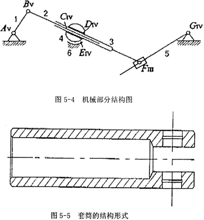 首先將原來的原理圖轉(zhuǎn)換成以下的機(jī)構(gòu)結(jié)構(gòu)圖(僅部分轉(zhuǎn)換),如圖5-4,即原來2、3構(gòu)件之間是滑塊和連桿連接,現(xiàn)改為連桿、套筒改為加一個(gè)擺動(dòng)軸結(jié)構(gòu),原來滑塊3和地面連接,容易形成過約束,改為加一個(gè)擺動(dòng)軸承4來和地面、套筒來連接。擺動(dòng)軸承內(nèi)芯相當(dāng)于一個(gè)球副,其轉(zhuǎn)動(dòng)中心必為內(nèi)芯的球心,當(dāng)然也是整個(gè)擺動(dòng)軸承的中心。這樣便于加工查和實(shí)驗(yàn)實(shí)施,而且更重要的是可防止原來原理圖中桿件連接出形成過約束。