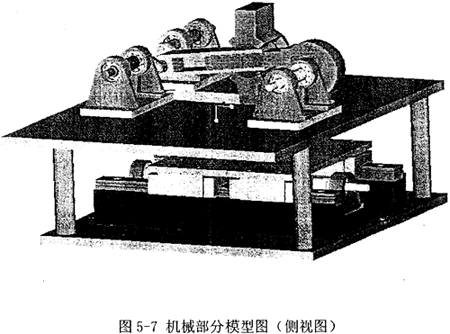 如圖5-1所示為實(shí)驗(yàn)系統(tǒng)機(jī)械部分的模型圖片,為了顯示清楚,沒有配置外邊的機(jī)箱,整個(gè)機(jī)構(gòu)是完全開放式的,這樣也便于實(shí)驗(yàn)觀察。該機(jī)械結(jié)構(gòu)由上下兩個(gè)機(jī)架支撐,和前面的原理圖不同,下邊機(jī)架上放置昆旋導(dǎo)軌構(gòu)件(未顯示伺服電機(jī)),上邊機(jī)架則是上圖所示的其余連桿機(jī)構(gòu)及其支撐架、軸承等(未顯示常速電機(jī))。