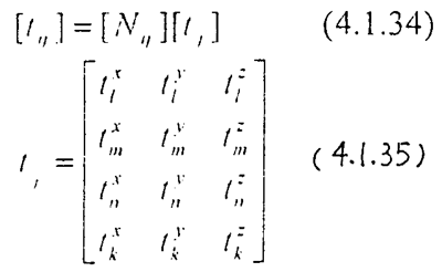 矩陣內(nèi)項(xiàng)表示分布力在單元角點(diǎn)l,m,n,k上沿x,y ,z的分量。對(duì)于一個(gè)單元有