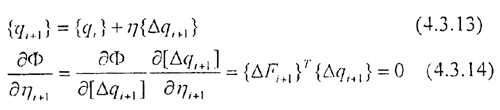 在求解方程(4.3.8)時,,尋求一個n 階矢量{q } ,實際上是在n 維空間找到一個方向和步長來滿足該方程。對于非線性方程組,要經過多次迭代,每次迭代均要找到一個方向和步長,逐步達到平衡解,為了加速迭代的收斂,在由式(4.3.12)決定的力向上尋求一個優(yōu)化的步長,即將{△q}乘以某一標量η而使迭代加快。決定η 的原則是使能量增量φ最小化,即: