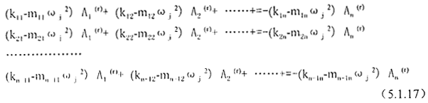 式(5.1.12)(5.1.13)都稱(chēng)為系統(tǒng)的特征方程或頻率方程,將其展開(kāi)后可得到(ωn2的n次代數(shù)方程式: