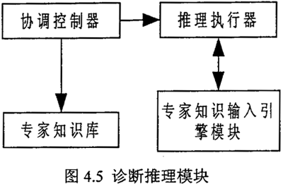 推理模塊是一個(gè)隱藏于后臺(tái)的推理計(jì)算模塊,它的結(jié)構(gòu)如圖4.5,協(xié)調(diào)控制器用來(lái)管理各推理機(jī)的工作并協(xié)調(diào)推理執(zhí)行器與專家知識(shí)輸入引擎模塊可知,對(duì)一示同的故障,其“數(shù)據(jù)層”、“故障現(xiàn)象層”、“故障原因?qū)印奔捌渌鼈冎g的連線關(guān)系絕不相同,協(xié)調(diào)控制器就是將“數(shù)據(jù)層”、“故障現(xiàn)象層”、“故障原因?qū)印奔捌渌鼈冎g的連線關(guān)系自動(dòng)轉(zhuǎn)化為推理進(jìn)程關(guān)系,由推理執(zhí)行器完成推理診斷工作。