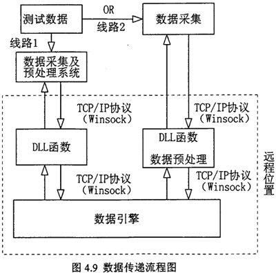 網(wǎng)絡(luò)化遠(yuǎn)程故障診斷的實(shí)現(xiàn),其關(guān)鍵是遠(yuǎn)程數(shù)據(jù)的傳送、存貯及數(shù)據(jù)交換處理。故障診斷系統(tǒng)遠(yuǎn)離故障設(shè)備現(xiàn)場(chǎng),只要故障現(xiàn)場(chǎng)故障測(cè)試數(shù)據(jù)能即時(shí)通過(guò)網(wǎng)絡(luò)傳送到故障診斷系統(tǒng)中,故障診斷系統(tǒng)即能實(shí)現(xiàn)網(wǎng)絡(luò)化遠(yuǎn)程故障診斷。當(dāng)智能故障診斷中的推理機(jī)進(jìn)行推理時(shí),通過(guò)數(shù)據(jù)引擎向動(dòng)態(tài)連接庫(kù)DLL函數(shù)申請(qǐng)數(shù)據(jù),這些數(shù)據(jù)是推理時(shí)需要的故障特征參數(shù)變量值。動(dòng)態(tài)連接庫(kù)DLL函數(shù)則通過(guò)網(wǎng)絡(luò)直接從故障現(xiàn)場(chǎng)測(cè)試采集計(jì)算機(jī)中得到故障信息數(shù)據(jù)。數(shù)據(jù)傳送流程圖如圖4.9 所示。