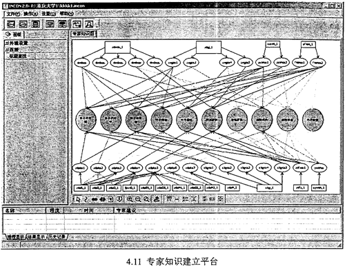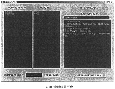 根據(jù)給出的數(shù)據(jù)端口及數(shù)據(jù)格式,即可按用戶的要求設(shè)計(jì)診斷結(jié)果輸出平臺(tái)。診斷結(jié)果應(yīng)給出診斷故障的名稱、故障發(fā)生的部位,故障發(fā)生的時(shí)間及程度。對(duì)于不同的故障,提示故障發(fā)生的可能原因,給出相應(yīng)的專家建議或維修方法等。圖4.10為本文集成系統(tǒng)的診斷結(jié)果輸出用戶界面。圖4.11為本文集成系統(tǒng)的專家知識(shí)庫(kù)建立及診斷推理平臺(tái)。
