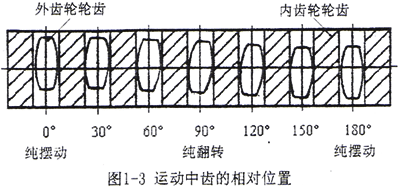鼓形齒聯(lián)軸器的運(yùn)動(dòng)狀態(tài)是復(fù)雜的空間運(yùn)動(dòng)。現(xiàn)有資料均把它簡(jiǎn)化為展開的平面運(yùn)動(dòng)進(jìn)行分析,在有軸間傾角的狀態(tài)下,將運(yùn)動(dòng)分為齒的擺動(dòng)運(yùn)動(dòng)和翻轉(zhuǎn)運(yùn)動(dòng)。這兩種運(yùn)動(dòng)在嚙合半周中經(jīng)歷純擺動(dòng)—復(fù)合運(yùn)動(dòng)—純翻轉(zhuǎn)—復(fù)合運(yùn)動(dòng)—純擺動(dòng)的循環(huán)運(yùn)動(dòng)過(guò)程,如圖1-3所示。純擺動(dòng)—純翻轉(zhuǎn)的相位差為90°。在非純擺動(dòng)和純翻轉(zhuǎn)運(yùn)動(dòng)過(guò)程中,內(nèi)外齒的相對(duì)運(yùn)動(dòng)是擺動(dòng)運(yùn)動(dòng)和翻轉(zhuǎn)運(yùn)動(dòng)的復(fù)合運(yùn)動(dòng)[68]。顯然這種簡(jiǎn)化分析方法是很粗略的,無(wú)法確切地描述空間嚙合狀態(tài),但是它對(duì)于分析齒向位移、棱邊卡死現(xiàn)象及說(shuō)明某一輪齒所處周向位置是有意義的。