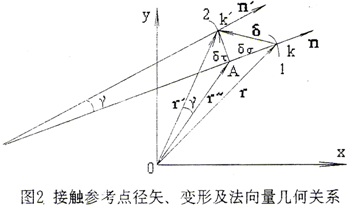 通常情況下,變形量相對(duì)于曲面參考點(diǎn)徑矢的大小為微小量,其切向分量更小,主要由撓曲變形引起。由(2-6-1)式知,γ值非常小。一般情況下,可忽略這一法線(xiàn)方向的改變,認(rèn)為變形后的接觸參考點(diǎn)法線(xiàn)方向不變,以便于求解。