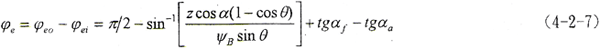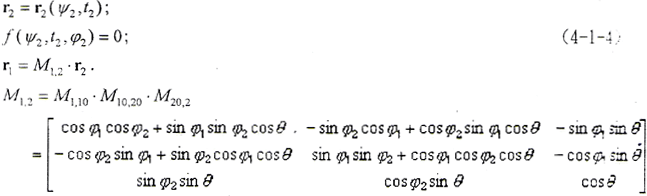 (4-1-9)式中,φ1、φ2為二齒面的轉(zhuǎn)角,令φ1=φ2=φ,將(4-1-2)式及由(4-1-8)式解出的t2代入(4-1-9)式,即可得到以ψ2、φ為參變量的外齒輪齒面方程。