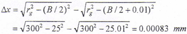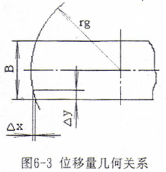 位移傳感器根據(jù)運動的型式不同分為直線位移傳感器和角度位移傳感器,直線位移傳感器常見的有光柵位移傳感器、感應同步傳感器等,它們可以直接安裝在所測直線運動部件上,無傳動誤差影響,精度高。但是由于結(jié)構(gòu)的原因,它們需要非常精確的安裝基準和合適的安裝空間,且通常情況下安裝定位較困難。由于光柵的密封性較差,光柵材料較脆弱,所以它們的抗污染性能和抗振性能也較差,而且所需防護裝置也較復雜,成本較高。角度位移傳感器最常用的有光電編碼器,它具有精度高,體積小,安裝方便、密封性好、抗污染和抗振性能好等優(yōu)點。本設計需測刀架的位移,在刀架上,切削冷卻潤滑油、切屑及粉塵的飛濺較嚴重,且不易設置防護裝置。如果采用光電編碼器需通過檢測絲桿的角位移間接檢測刀架的直線位移,但絲桿及傳動機構(gòu)具有的傳動精度和位移檢測精度是足夠的。另外,加工鼓形齒輪時,形成鼓度曲線的實際切削位置通常在曲線較陡的范圍,例如加工圓弧鼓度曲線,幾何關系見圖6-3,設位移圓半徑rg=300mm,齒寬B=50mm,當Δy=0.01mm,則