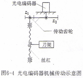 由于機床的刀架進給絲桿的位置及結(jié)構(gòu)關系,通常不能將光電編碼器直接聯(lián)接在刀架進給絲桿的端頭,需將絲桿的旋轉(zhuǎn)運動通過一對齒輪傳至光電編碼器。機械傳動示意圖如圖6-4所示。
