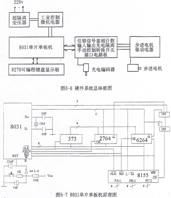 數(shù)控硬件由8031、外擴一片程序存貯器芯片2764、外擴一片數(shù)據(jù)存貯器6264和外擴一片通用可編程并行輸入/輸出接口芯片8155、總線、片選擇碼電路、采用8279芯片的通用鍵盤顯示電路和位移鑒相輸入及驅(qū)動輸出的接口電路組成。數(shù)控系統(tǒng)的現(xiàn)場抗干擾性能直接關系到整個系統(tǒng)的成敗。在硬件方面,為了防止強電電網(wǎng)的電壓尖峰和毛刺對系統(tǒng)的干擾,采用抗干擾能力強的工業(yè)用微機電源、超隔離變壓器、片選法譯碼電路、光電隔離電路。