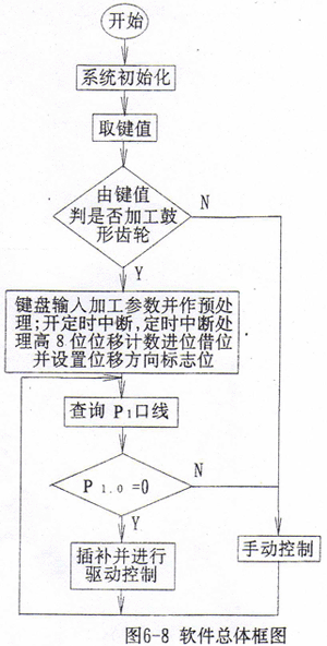 本系統(tǒng)的軟件采用模塊化設計,主要包括系統(tǒng)初始化、數(shù)據(jù)輸入和顯示、插補運算和驅(qū)動控制、定時中斷處理位移信號、自動與手動控制等功能模塊。軟件總體框圖如圖6-8所示。
