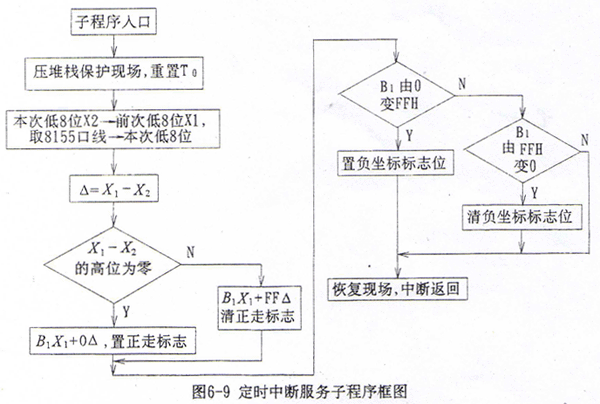 位移脈沖計數(shù)的高8位的處理采用差值法,設前后兩次的低8位二進制數(shù)為X1、X2,高8位二進制數(shù)為B1、B2,先求差值△=X2-X1,若△的最高位為1,則此時整個16位計數(shù)的十六進制數(shù)為B1X1+FF△;若△的最高位為0,則為B1X1+0△。相應的,若△的最高位為1時,當前刀架向Y坐標負方向運動;若△的最高位為0時,當前刀架向Y坐標正方向運動。而高8位由FFH變?yōu)?0H時,當前刀架位置在Y坐標大于零;高8位由00H變?yōu)镕FH時,當前刀架位置在Y坐標小于零,此時應取Y坐標補碼進行插補運算。定時中斷服務子程序框圖見圖6-9。