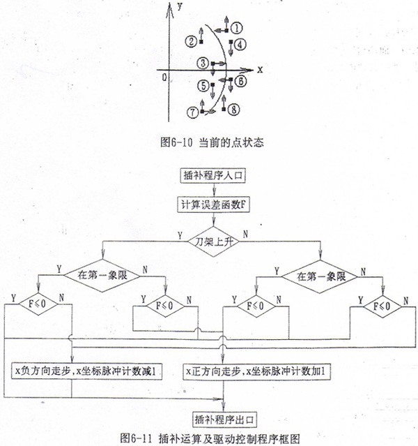 非圓弧曲線插補運算時,首先根據(jù)當前的Y坐標值及插補曲線f(x,y)=0,求解出x坐標理論值xt,設當前的實際x坐標為xr,令誤差函數(shù)F=xr-xt。對圓弧曲線,根據(jù)當前的x、y坐標,計算x2+y2值,令誤差函數(shù)F=x2+y2-R2。根據(jù)當前點在不同象限、當前刀架的運動方向及誤差函數(shù)的正負,共有8種情況出現(xiàn)(如圖6-10所示),應根據(jù)它們的狀態(tài)進行不同的處理。①、⑥兩種情況應使當前點向x坐標負方向走步;③、⑦兩種情況應使當前點向x坐標正方向走步;②、④、⑤、⑧四種情況無需在x坐標方向走步。由于在切齒過程中刀架的進給速度較低,最高一般不超過30毫米/分鐘,兩次y坐標計數(shù)脈沖間隔時間可達幾十毫秒,而插補運算的時間不超過1毫秒,因此插補速度足夠。在刀架快速運動時,插補有滯后,但此時不切削,這種滯后不影響加工。在插補過程中,顯示器輪流顯示當前的x、y坐標值,以利于操作者監(jiān)視加工情況,因此還需進行顯示BCD碼的轉(zhuǎn)換和輪換的控制。插補運算及驅(qū)動控制程序框圖見圖6-11。
