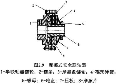 圖2.9 就是摩擦安全聯(lián)軸器的一種型式。工作時由主動軸帶動輪盤6,鏈輪3夾在兩摩擦片之間,摩擦片的壓緊力由壓板7,碟形彈簧4及調(diào)節(jié)螺母調(diào)節(jié)。如果傳遞的轉(zhuǎn)矩不大于摩擦片與鏈輪之間摩擦力所能產(chǎn)生的極限轉(zhuǎn)矩,鏈輪3 可通過雙排滾子鏈2將轉(zhuǎn)矩傳給半聯(lián)軸器鏈輪1(與被動軸聯(lián)接),實現(xiàn)扭矩的傳遞。