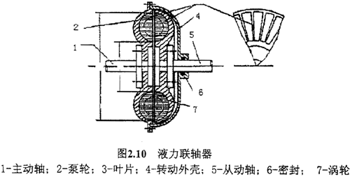 液力聯(lián)軸器中,充有工作油。當(dāng)原動機通過主動軸帶動泵輪旋轉(zhuǎn)時,因離心力的作用,工作油在葉片的帶動下由內(nèi)側(cè)(進口)流向外緣(出口),形成高壓高速的液流,高壓高速的液流沖擊渦輪葉片,使渦輪跟著泵輪同向旋轉(zhuǎn)。工作油在渦輪中,由外緣(進口)流向(內(nèi)側(cè))出口的過程中減壓減速,然后再流入泵輪的進口。不斷地循環(huán),把工作油的動能和壓力能換成機械功,通過從動軸輸出,帶動工作機器。整個過程實現(xiàn)了從主動軸到從動軸的傳動。