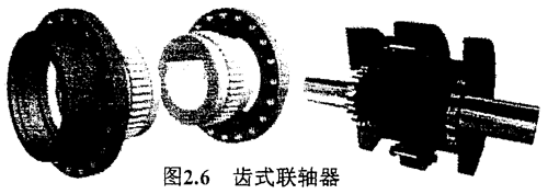 齒式聯(lián)軸器構(gòu)造如圖2.6所示,主要由兩具有相同齒數(shù)的外齒軸套和兩帶有凸緣的內(nèi)齒圈等零件組成。兩外齒軸套分別用鍵聯(lián)接固定在被聯(lián)接兩軸的軸端,兩內(nèi)齒圈的內(nèi)齒與軸套上的外齒相嚙合,其凸緣用螺栓聯(lián)接,從而實現(xiàn)兩軸的聯(lián)接。