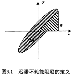 粘彈性材料在簡諧波交變動態(tài)載荷作用下,應(yīng)變滯后于應(yīng)力一個相角φ,因此在一個循環(huán)周期內(nèi),應(yīng)力應(yīng)變遲滯回線為—標準的旋轉(zhuǎn)橢圓,如下圖3.1所示,這一橢圓回線的面積△W代表了材料阻尼能力大小,即單位體積耗散的能量,三角形面積W為材料所儲存的最大彈性能密度。