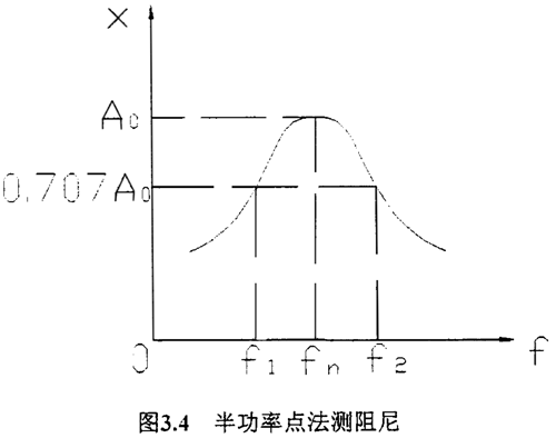 由振動理論知,一個振動系統(tǒng)的能量是與其振幅的平方成正比。系統(tǒng)強迫振動的能量在共振點前后能量為共振時能量的1/2處的兩個頻率f1、f2稱為半功率點頻率,則此半功率點頻率這差值與系統(tǒng)的阻尼比之間有如下關(guān)系