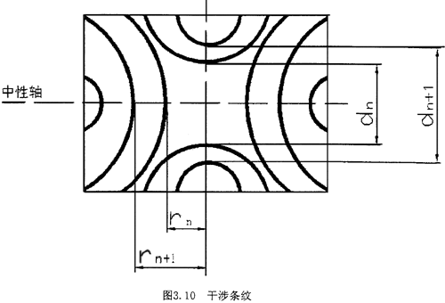 在干涉式測量系統(tǒng)中,輔助玻璃片與變形的試件表面間形成一層薄膜。當光源經(jīng)擴束透鏡和半反透射鏡垂直照射時,入射光將在些薄膜上下表面反射,產(chǎn)生具有一定光程左的兩束相干光,產(chǎn)生一系列明暗交替的雙曲線,在計數(shù)顯微鏡中將觀察到雙曲線等厚干涉條紋,如圖3.10所示。