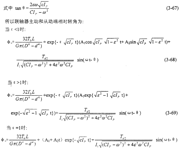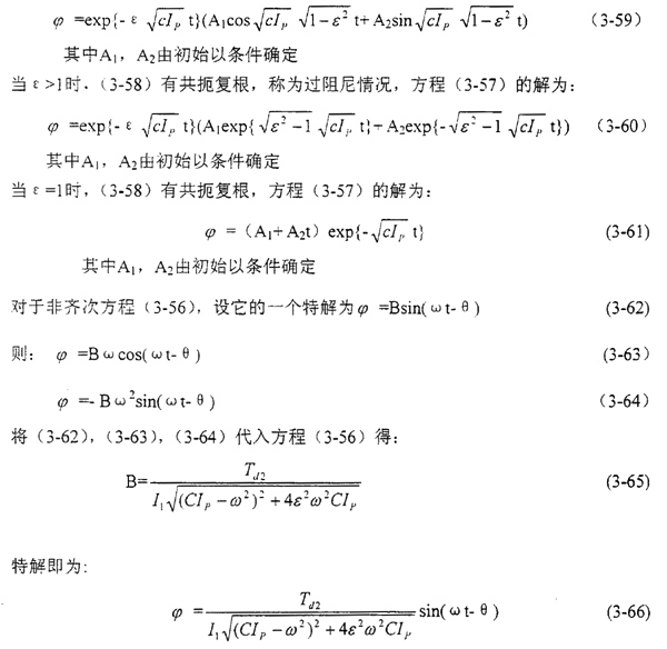 現(xiàn)單獨(dú)考慮擾動(dòng)轉(zhuǎn)矩產(chǎn)生的相對(duì)轉(zhuǎn)角φ2,目前國(guó)內(nèi)建立了圖3.13所示力學(xué)模型[2],出于橡膠件相對(duì)于兩側(cè)的鐵圈剛性很小,現(xiàn)假設(shè):(1)只有聯(lián)軸器兩側(cè)的鐵圈具有剛性,只有橡膠具有彈性和阻尼;(2)聯(lián)軸器主動(dòng)側(cè)作用有按簡(jiǎn)諧規(guī)律變化的擾動(dòng)轉(zhuǎn)矩分量Tdlsinωt此時(shí)按照動(dòng)量矩定理,按聯(lián)軸器兩側(cè)力矩平衡條件,可以分別列出兩個(gè)圓盤的轉(zhuǎn)動(dòng)運(yùn)動(dòng)方程式,即系統(tǒng)振動(dòng)的微分方程是: