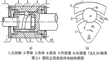 圖2-1所示為圓柱正弦活齒傳動機構(gòu)的結(jié)構(gòu)簡圖,圓柱正弦活齒傳動由主動軸、殼體、導(dǎo)架及活齒這四個部分組成。殼體的內(nèi)圓柱表面上有周期數(shù)為Z3的內(nèi)正弦滾道,軸承7、8、9、10支撐導(dǎo)架,導(dǎo)架圓周面上均勻分布著軸向活齒槽。軸承7、9支撐主動軸,其外圓柱面上有周期數(shù)為Z1的外正弦滾道,在內(nèi)滾道、外滾道及導(dǎo)架活齒槽的交錯區(qū)域內(nèi)安裝有球形活齒。