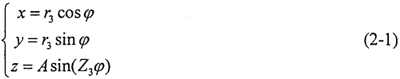 圓柱正弦活齒傳動中的正弦滾道是由活齒中心沿空間正弦軌跡曲線運動包絡(luò)而成的。為便于該傳動機構(gòu)的加工制造和進一步理論分析的研究,有必要建立正弦滾道的齒面方程。
