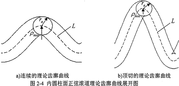 以殼體的正弦滾道為例,將殼體的內(nèi)圓柱面沿圓柱直母線方向展開后如圖2-4所示。當(dāng)殼體內(nèi)圓柱面上正弦軌跡曲線L的最小曲率半徑ρmin大于活齒嚙合部分小圓半徑ra時,殼體正弦滾道的理論齒廓曲線是連續(xù)的(圖2-4a);當(dāng)ρmin<ra時,理論齒廓曲線發(fā)生頂切(圖2-4b)。殼體內(nèi)圓柱上正弦軌跡曲線L的方程可表達為: