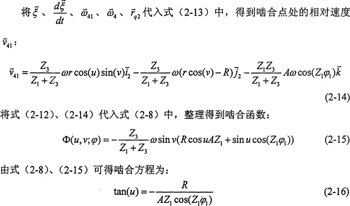 將活齒齒面方程(2-8)的坐標(biāo)轉(zhuǎn)換到σ1上,并與嚙合方程(2-16)聯(lián)立,即可得到主動軸齒面∑1的方程,即