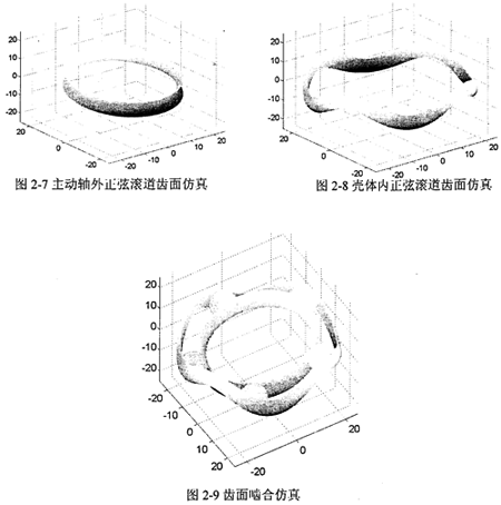 采用Matlab工程軟件對圓柱正弦活齒傳動進行齒面仿真的研究。為仿真出三維曲面,在接觸線上劃分100個單元,在齒面圓周方向劃分1001個單元,由此將齒廓曲而劃分為100×1001的網(wǎng)格。根據(jù)數(shù)學(xué)模型計算出各個網(wǎng)格節(jié)點對應(yīng)的數(shù)值,得到齒廓曲面的網(wǎng)格圖,然后采用二維線性插值的方法,得到整個齒廓的曲面仿真及齒面嚙合偏真如圖2-7~圖2-9所示。