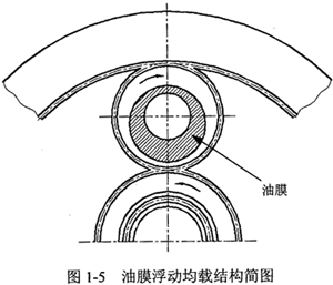 代表世界先進水平的油膜浮動均載裝置以其結(jié)構(gòu)緊湊、重量輕、成本低、安裝方便、減振性能好、對選用的行星輪數(shù)目不限、高低速行星傳動均可采用、工作平穩(wěn)、均載效果好等一系列優(yōu)點受到國內(nèi)外許多生產(chǎn)廠家和研究機構(gòu)的重視。這是一種日本高橋崇等人發(fā)明的并取得多國專利的均載裝置,是利用厚油膜彈性作用使行星輪浮動實現(xiàn)均載的,國外許多廠家(如日本的東洋精機)已用此項發(fā)明生產(chǎn)了許多用于船舶蒸汽輪機、工業(yè)用齒輪減速器、甲板起重機減速器等裝置。由于該專利的關(guān)鍵技術(shù)資料十分保密,這引起許多國家探索其奧秘的興趣。這種均載方式是基于滑動軸承理論,在行星輪與行星輪軸承(或心軸)之間裝入一中間環(huán),該環(huán)與行星輪孔之間留有徑向間隙并儲有潤滑油。當傳動時,行星輪與中間環(huán)以同一方向、同一轉(zhuǎn)速旋轉(zhuǎn),并承受方向相同的載荷,這個轉(zhuǎn)動使它們之間形成了厚油膜實現(xiàn)行星輪浮動,厚油膜較普通滑動軸承的油膜厚度大的多。當行星輪間載荷分配不均衡時,徑向力大時其油膜厚度相對最小,油楔夾角也隨之減小,即各行星輪對心軸產(chǎn)生不等量的位移從而實現(xiàn)均載。其原理如圖1-5所示。
