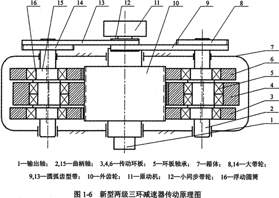 其工作原理為:小同步帶輪12隨原動機11作高速旋轉(zhuǎn),通過嚙合,小帶輪通過平頂圓弧齒型帶9和13帶動兩個大帶輪8和14旋轉(zhuǎn),實現(xiàn)一級減速和功率分流,兩個大帶輪分別帶動三環(huán)減速器的雙曲柄的同步輸入,三環(huán)減速器的雙曲柄的同步輸入,三片傳動環(huán)板3、4和6上的內(nèi)齒圈與輸出軸1上的外齒輪10相嚙合,形成大傳動比,實現(xiàn)二級減速及動力傳遞。三內(nèi)齒環(huán)板中的兩側(cè)環(huán)板與中間環(huán)板相差180°,且兩側(cè)各環(huán)板厚度為中間環(huán)板的1/2,這樣可保證運轉(zhuǎn)時它們的慣性力理論上完全平衡。為克服雙曲柄機構(gòu)的死點,一級傳動采用同步帶傳動,增加了一級帶傳動不僅可實現(xiàn)兩個曲柄機構(gòu)的同步輸入,同時,由于同步齒形帶是彈性元件,還可實現(xiàn)兩曲柄軸載荷均載。三環(huán)減速器輪齒嚙合的均載是采用在兩曲柄軸偏心套外表面和轉(zhuǎn)臂軸承內(nèi)表面之間插入一個浮動圓筒16,在曲柄軸旋轉(zhuǎn)時,偏心套和圓筒之間、圓筒和轉(zhuǎn)臂軸承內(nèi)表面之間均形成了動壓油膜,厚油膜的彈性變形使得內(nèi)齒環(huán)板浮動,補償減速器的制造和安裝誤差以及傳動時產(chǎn)生的零部件變形。樣機的傳動性能和振動性能以及均載試驗證實,本文提出的完全平衡、均載減振兩級三環(huán)齒輪減速器有著較好地力學性能,較現(xiàn)有三環(huán)減速器的振動要小、壽命要長。