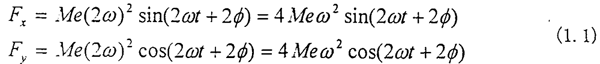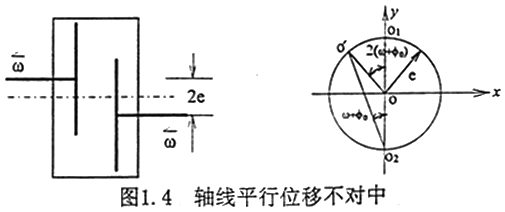 不對中具有一些典型的特征,如不對中比較嚴(yán)重時會使軸承的油膜壓力偏離正常值,聯(lián)軸器不對中時聯(lián)軸器兩端軸承的振動較大,軸心位置不穩(wěn)定,而且在振動頻譜中二倍頻分量幅值較大等。而對于齒輪聯(lián)軸器不對中產(chǎn)生倍頻振動分量的機理研究又是其中的一個重點。文獻[68]指出,由于安裝時轉(zhuǎn)子軸心線不對中引起的振動,在用電機驅(qū)動的轉(zhuǎn)子系統(tǒng)中,當(dāng)電機軸與負(fù)載機械由齒輪聯(lián)軸器連接時,電機軸存在二倍頻的振動,而在單獨運動時,倍頻振動立即消失,這表明倍頻振動完全是齒輪聯(lián)軸器耦合的結(jié)果。文獻[64,65]解釋了由于齒輪聯(lián)軸器不對勁中而產(chǎn)生二倍頻振動的機理,以[65]中的軸線平行位移不對中為例見圖1.4,圖中ω為轉(zhuǎn)子的轉(zhuǎn)動的解速度,2e為不對中量,M為內(nèi)齒套的質(zhì)量,φ0為起始回轉(zhuǎn)角。