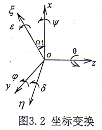 設(shè)將整個軸承—轉(zhuǎn)子—齒輪聯(lián)軸器系統(tǒng)劃分成n個軸段和n個結(jié)點,在第j個結(jié)點處存在一個半齒輪聯(lián)軸器系統(tǒng),如圖3.1所示。將外齒輪和內(nèi)齒套均看作一當(dāng)量圓盤,并滿足小擾動假設(shè),不計軸向運動,則圓盤的運動可用其中心的位移(xj,yj)和相應(yīng)的偏轉(zhuǎn)角(φj,ψj,θj)來表示,其中三個偏轉(zhuǎn)角的意義見圖3.2。設(shè)oxyz為固定坐標(biāo)系,oξηz為相應(yīng)的旋轉(zhuǎn)坐標(biāo)系,下面就以此為模型用拉格朗日方程來建立該子系統(tǒng)的運動微分方程。