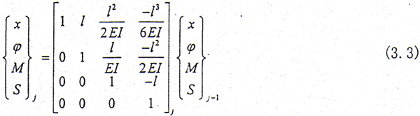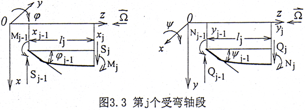 其中 Sj-1,Mj-1,Nj-1,Sj,Mj,Qj,Nj分別為作用于第j-1、j個結(jié)點處軸截面上的剪力和彎矩,根據(jù)平衡方程則第j個軸段在x方向