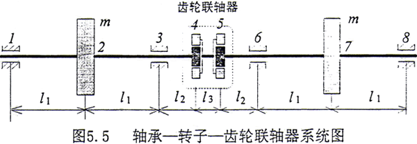 以上我們建立了半聯(lián)軸器系統(tǒng)的運(yùn)動方程,而在實際系統(tǒng)中往往是由二對內(nèi)外齒輪同時嚙合傳動(例如CL和CLZ型齒輪聯(lián)軸器),軸承—轉(zhuǎn)子—齒輪聯(lián)軸器系統(tǒng)如圖5.5所示。