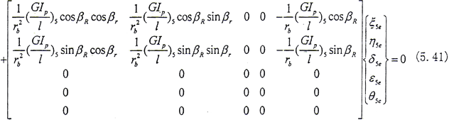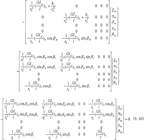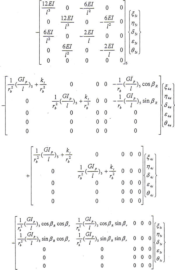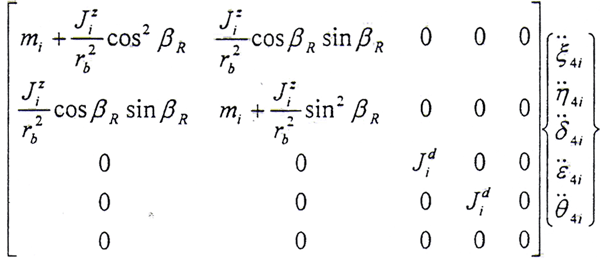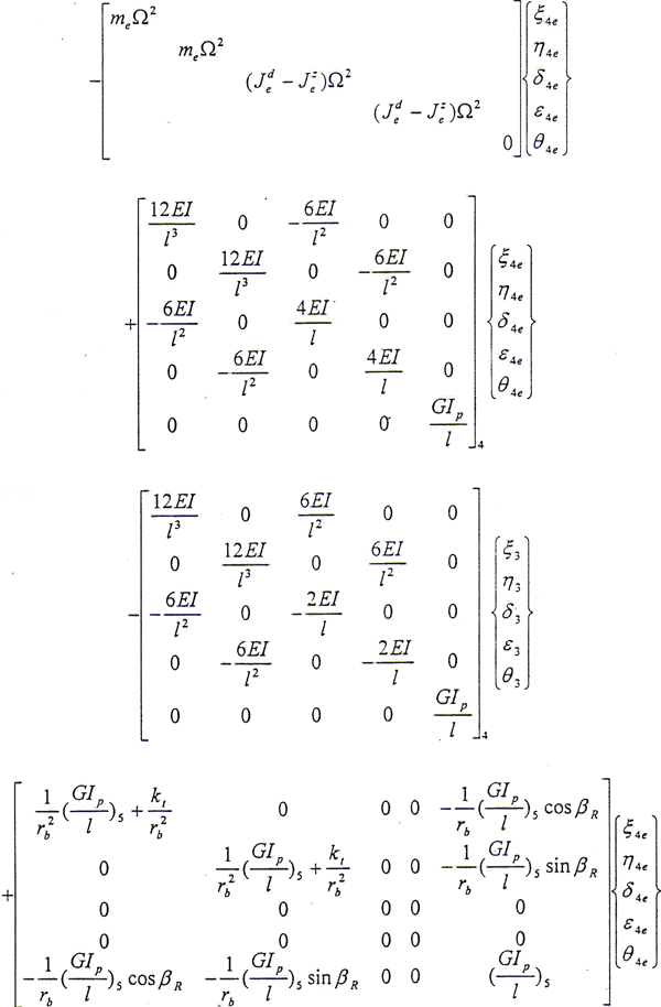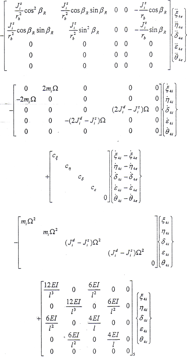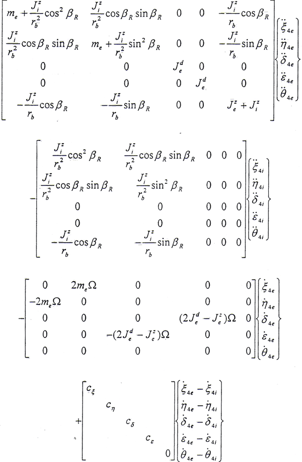 在式(5.27)和式(5.28)中,由于包含了θj+1(即為圖5.5中的θ5i)。而θ5i又必須要滿足以上的約束關(guān)系,所以可以想象在考慮了二個半聯(lián)軸器后,耦合關(guān)系更為復(fù)雜。但處理的方法是類同的,具體過程在此不再重復(fù)了。整個系統(tǒng)有8個結(jié)點,共48個自由度。下面僅列出結(jié)點4處的運(yùn)動微分方程。