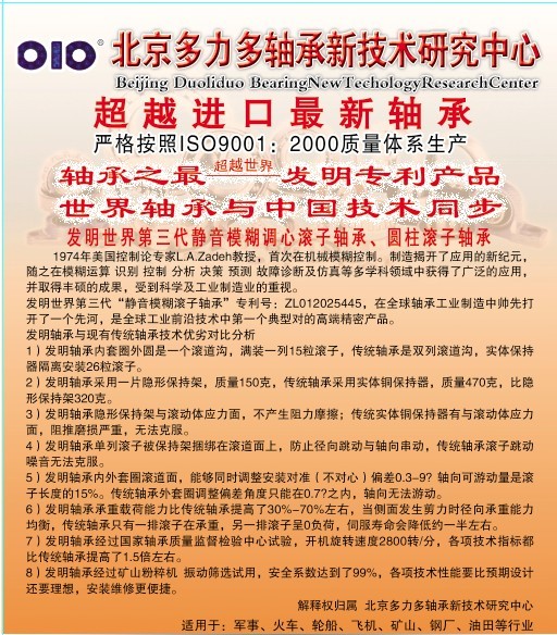 高端軸承新技術(shù)專利簡(jiǎn)介    高端軸承新技術(shù)發(fā)明專利簡(jiǎn)介:本廠發(fā)明了高端滾動(dòng)調(diào)心滾子軸承(三類), 高端園柱滾子(二類),在承重方面保持了傳統(tǒng)軸承的各種優(yōu)點(diǎn),承截能力加強(qiáng)了,不同之處在于它沒(méi)有傳統(tǒng)的保持架,同時(shí)沒(méi)有了
