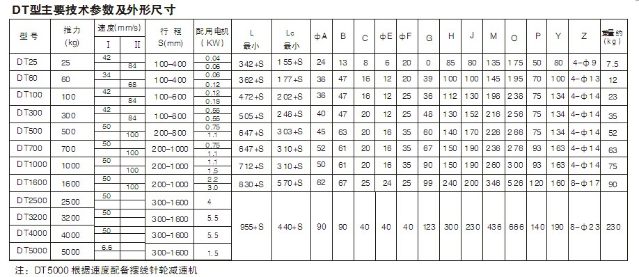 DT系列電動推桿是一種將電能轉(zhuǎn)換成往復(fù)運(yùn)動機(jī)械能的通用機(jī)械手,適用于各種復(fù)雜或簡單的工藝流程,具有結(jié)構(gòu)緊湊,安裝方便,使用可靠,維修簡單,節(jié)約能源等優(yōu)點(diǎn)。與液壓氣動系統(tǒng)相比,不但省掉了繁雜的系統(tǒng)和減輕了重量,而且不受氣候及環(huán)境的限制,可實現(xiàn)遠(yuǎn)距離集中或自動控制,廣泛應(yīng)用于冶金、礦山、電力、煤炭、交通、糧食、化工、建材等部門。 二、電動推桿結(jié)構(gòu)與性能: 1、結(jié)構(gòu): 電動推桿由電動機(jī)、減速齒輪、絲桿、銅螺母、導(dǎo)向套、活塞桿、軸承座、軸承座、彈簧、缸筒座、聯(lián)接叉及光電接近開關(guān)裝置(用戶選購)等部件所組成。 2、工作原理: 電動機(jī)通過一級或二級齒輪減速后,帶動絲杠螺母付,把電動機(jī)的旋轉(zhuǎn)運(yùn)動變?yōu)橹本運(yùn)動,利 用電動機(jī)正反轉(zhuǎn)實現(xiàn)推桿往復(fù)動作。輸出推拉力相等。通過各種杠桿力臂長度,可以增長行程。 3、過載自動保護(hù)功能: 電動推桿內(nèi)過載自動保護(hù)裝置,當(dāng)推桿行程到極限位置或負(fù)載超過額定推力一定數(shù)值時,推桿 將自動切斷電源,起到保護(hù)作用,使電動機(jī)及其它構(gòu)件不致?lián)p壞,但不得以此作為正常運(yùn)行時的限 位開關(guān)使用。因此要求在本機(jī)上另行配置外行程限位開關(guān)裝置,本廠可為用戶配置光電接近開關(guān)裝 置,以控制推桿正常起停。 一、原理和功能