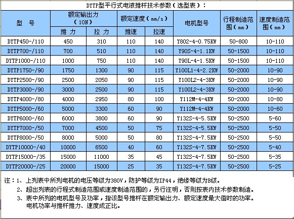 除上述三種調(diào)節(jié)功能定貨時必須文字注明外,其他請參照型號編制方式,認(rèn)真填寫六大要素。 DYTP型平行式電液推桿技術(shù)參數(shù)(選型表)