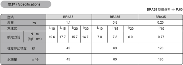BRA 28·容許軸向負(fù)載1 5kgf·容許徑向負(fù)載3 0kgf·容許傳遞扭矩3kgf cm·遲滯量±180角秒·減速比1/10·質(zhì)量120g·型式表示僅為BRA28—10