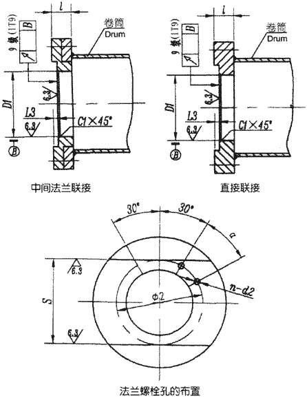 聯(lián)軸器與鋼絲繩卷筒的聯(lián)接方式也可采用下圖所示結(jié)構(gòu),也有中間法蘭聯(lián)接和直接聯(lián)接兩種,具體要求如圖示,聯(lián)接尺寸見表7。