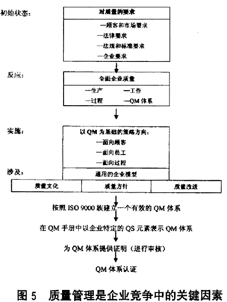 圖5 對(duì)本文所討論的企業(yè)競爭中的重要因素——質(zhì)量管理進(jìn)行總結(jié)。出發(fā)點(diǎn)是對(duì)各個(gè)方面提出的質(zhì)量要求作詳細(xì)說明。為滿足質(zhì)量要求作出的反應(yīng),是提出全面企業(yè)質(zhì)量概念,這包括與產(chǎn)品、服務(wù)、過程和系統(tǒng)相關(guān)的質(zhì)量元素。